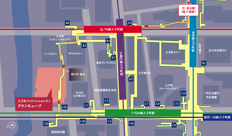 | 経路 | 大手町駅 東京メトロ: 東西線・千代田線・半蔵門線・丸ノ内線 都営:三田線 東京駅(地下道にてアクセス可能) JR各線(山手線・京浜東北線・中央線・総武線・京葉線他) 東京メトロ : 丸ノ内線 |