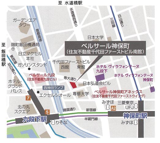 | 経路 | 「九段下駅」7番出口徒歩3分(東西線) 「九段下駅」5番出口徒歩4分(半蔵門線・新宿線) 「神保町駅」A2出口徒歩5分(半蔵門線・新宿線・三田線) 「水道橋駅」西口出口徒歩8分(JR線) *セミナー会場は、「ベルサール神保町」です! 近隣には、「ベルサール神保町アネックス」及び「ベルサール九段」がございますので、お間違えのないよう、ご注意ください。 |