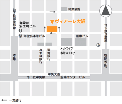 | 経路 | 地下鉄 御堂筋線・中央線「本町」駅下車 1・3番出口から徒歩3分 地下鉄 堺筋線・中央線「堺筋本町」駅下車 17番出口から徒歩5分 |