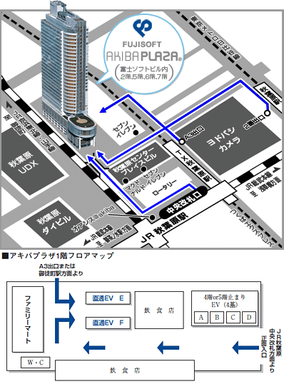 | 経路 | (JR線) 秋葉原駅 中央改札口より徒歩2分 (つくばエクスプレス線) 秋葉原駅 A3改札口より徒歩1分 (東京メトロ日比谷線) 秋葉原駅 2番出口より徒歩3分 ※6階セミナールームへは、1階奥にあるファミリーマート側の直通エレベーター(上図 E・F)をご利用ください。 正面入口側のエレベーターは4階または5階止まりとなります。 |