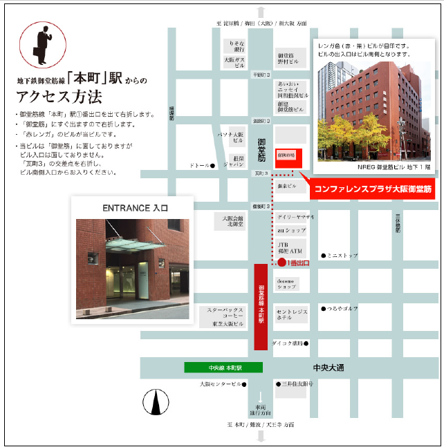 | 経路 | 地下鉄 御堂筋線・中央線「本町」駅下車 2番、3番出口より徒歩約4分 ※1番出口は、2019/5/15~2022/6月末(予定)閉鎖中 |